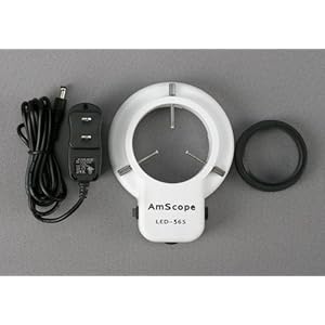 You are bidding on a 56-LED ring light with built-in intensity control and mounting size up to 2-1/4" (58mm) in diameter. The ring light has 2-3/16" (56mm) inside and 3-3/4" (95mm) outside diameters. It works with power supplies from 110V to 240V. It comes with a 1-7/8" (48mm in diameter) ring adapter. With variable intensity control, it provides cool, even, intense and focused shadow-free illumination. It is an ideal durable cool light source for microscopes. This kit comes with one year warranty against manufacturing defects. It is brand new in original box.