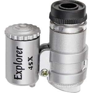 Explorer Compass - Microscope with LED Light with Silver Composition Housing. Model: EXP45. 1 3/8" x 1 /4" overall. Silver composition housing. Features two white LED's with on/off switch, eye lens, focus adjusting lens barrel and objective lens. 45x magnification. Uses three LR927 button cell batteries (included). Black leatherette storage pouch with velcro closure. Great for industrial use, medical science, coins and stamps, geography, circuit board, printing, gardening, education, house living or offices."